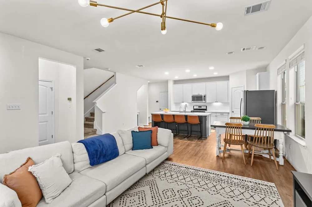 Located close to the heart of Dripping Springs within Texas Heritage Village, this two-story Meritage home offers new carpet and paint, Refrigerator, Washer/Dryer, 2 TVs and an unbeatable location. Built in 2017, the 1,992-square-foot layout features three bedrooms, two and a half baths, and two living areas, creating a functional and easy-flowing design. Downstairs, the open-concept main level connects the living, dining, and kitchen areas, perfect for entertaining or everyday living. All 3 bedrooms and 2 bathrooms are thoughtfully positioned upstairs along with the laundry room and a bonus room ideal for a play area or media space. The primary suite includes a full bath with large in shower and walk-in closet. Recent updates include new interior paint and carpet, making this home move in ready. The home has a rear-facing two-car garage with alley access, and an automatic sprinkler system for easy yard maintenance. Enjoy a low-maintenance lifestyle with a zero-lot-line yard and a location just two blocks from scenic trails that lead to Founder’s Park, HEB, and Downtown Dripping Springs where you can walk to fun events like Founder's Day, Christmas on Mercer and the Songwriter's Festival within minutes. With a low HOA fee, low tax rate, and access to top-rated Dripping Springs ISD schools, this property offers excellent value in one of the area’s most walkable communities.
