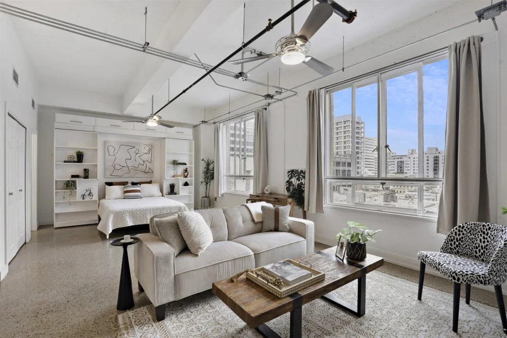Rare unit at the historic Brown Building in the heart of Downtown Austin! CRAZY PROPERTY TAX SAVINGS due to Historic Exemption! Owner-occupants of similar sized units paid LESS THAN $1,000 FOR 2025 IN PROPERTY TAX! This beautifully updated studio blends modern comfort with preserved character, including the original 1938 terrazzo flooring. High ceilings with exposed conduit feel crisp against neutral white walls, while the vertical scale adds depth and openness. Oversized, fully operable windows invite fresh air and have added panels for soundproofing and energy efficiency. East-facing downtown views flood the space with natural light, reflecting off nearby buildings so you can enjoy both sunrise and warm sunset hues in the late afternoon. The kitchen is fully equipped with premium granite countertops and backsplash that contrast cleanly with sleek white contemporary cabinetry. Tall, under-lit upper cabinets and a built-in pantry provide smart storage, and all appliances convey, including a front-load washer and dryer. The open studio-style bedroom flows seamlessly into the living area and features a refined Murphy bed with overhead storage and side bookcases. Tuck the bed away during the day to maximize living space and flexibility. Primo parking space on corner of best level of garage with no neighbor! HOA Fees include everything but electric and internet. Pet-friendly building! Amenities include new 2025 rooftop deck, fitness center, historic 1938 marble lobby, 3 fast elevators, secure callbox/fob system, garage parking, and a doggie yard/station across the street. Everything Downtown Austin is right at your doorstep! Very secure building on quiet corner of downtown 1 block away from, but not in the middle of, all the hustle and bustle. Don’t miss out on this rare opportunity to own your own urban retreat in the historic Downtown Brown Building – schedule a showing today!